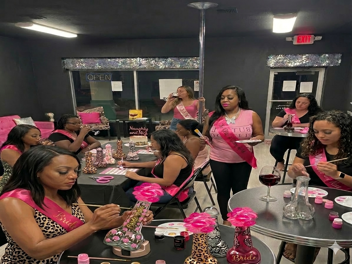 From the moment you arrive, you and your friends will be immersed in a fun and creative environment. Our guided sessions ensure everyone can create their own dazzling take-home souvenirs, whether it's beautifully decorated wineglasses or a personalized canvas. With a lively host, all necessary supplies, and the option for party games and a dance pole, your bachelorette party will be a hit!